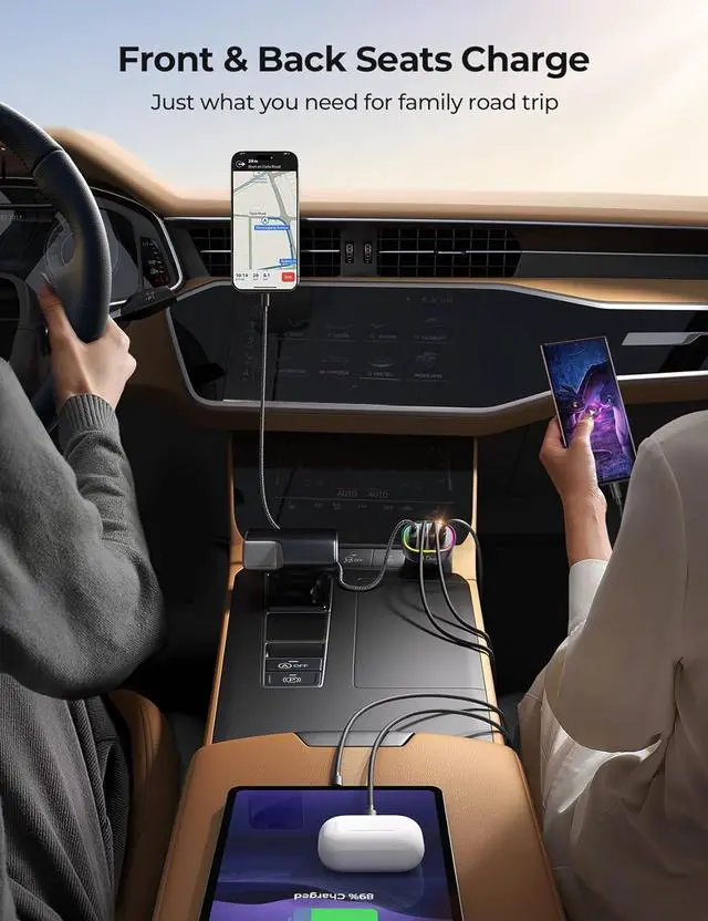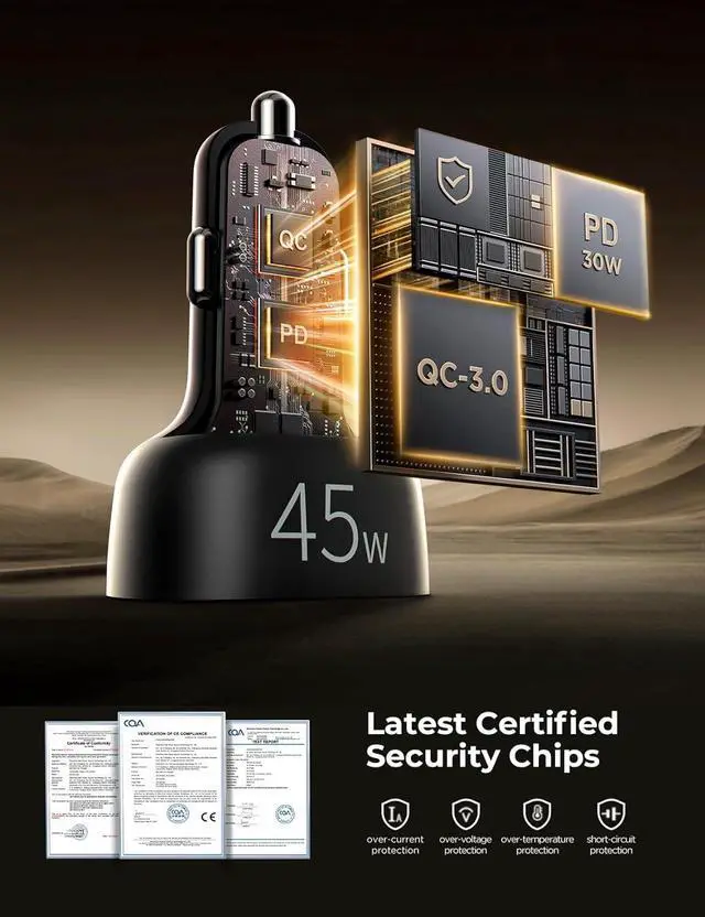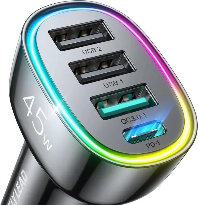 4 Port Car Charger 45W multi port charger adapter is equipped with 1 USB C ports and 3 USB A ports. Kids on the back of the car will love it while traveling. Because they wont have to fight for the problem who can use the cellphone car charger first. Best gifts for your trip.