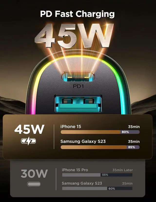 30W Type C &18W USB A PD 3.0 port output 30W (max), 3X faster than 2.1A charger, charges iPhone 14 Pro max from 0-50% in just 25 minutes. QC 3.0 port output 18W, charges most of android devices from 0% to 60% within 35 minutes. (Note: When two ports are charging at the same time, the C port and upper A port share 12V 2.5A )