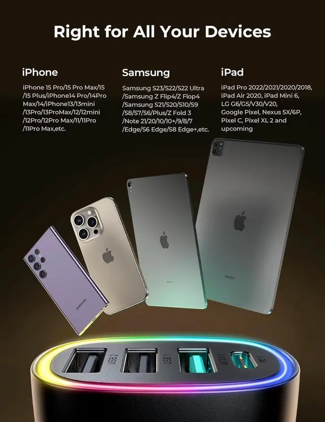 Universal Car Charger & Wide Compatibility The USB car charger is compatible with iPhone 15/15 Pro/15 Pro Max, 14 Pro Max/14 Pro/14 Plus/14 iPhone 13 Pro Max/iPhone 12/11/10/XR/XS, Samsung Galaxy S22 Ultra/Samsung S21 Ultra/S20 Note 20/10 A52 A71 A51 A10E S9 S9, Google Pixel 6 pro/6/5, sports watches, car recorders, car cameras and other USB-powered devices. Compatible with 12-24V cars, trucks, RV and etc.