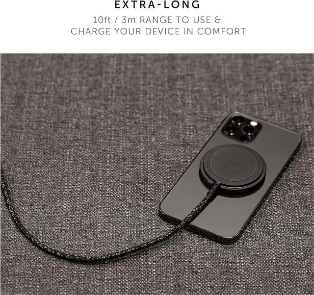 EXTRA-LONG: Extended 10ft / 3m range means youre free to use & charge your device from anywhere while an integrated genuine leather strap keeps you tangle-free when not in use