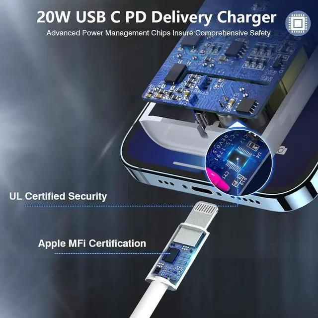 [Safe & Reliable Charging]: Certified by UL, ETL, FCC, CE, ROHS. The Power Delivery Wall Charger for iPhone owns bulit-in multi-protection system, avoiding from over-voltage, over-charge, over-heat, etc. The smart chip including in the MFi certified lightning cable match the current required by the Apple device automatically, charge your iPhone/iPad device fast, safely and steadily.