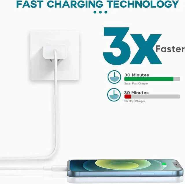 Super Fast Charger USB-C iPhone Charger With 6Ft USB C To Lightning CableThe USB-C Port PD Quick Adapter USB C wall charger and 6FT Type C to Lightning cable. The fast charger can charge the latest iPhone 14/13/12/11 full series to 50% in 30 minutes, can reach up to 3X faster than the original 5W charger.