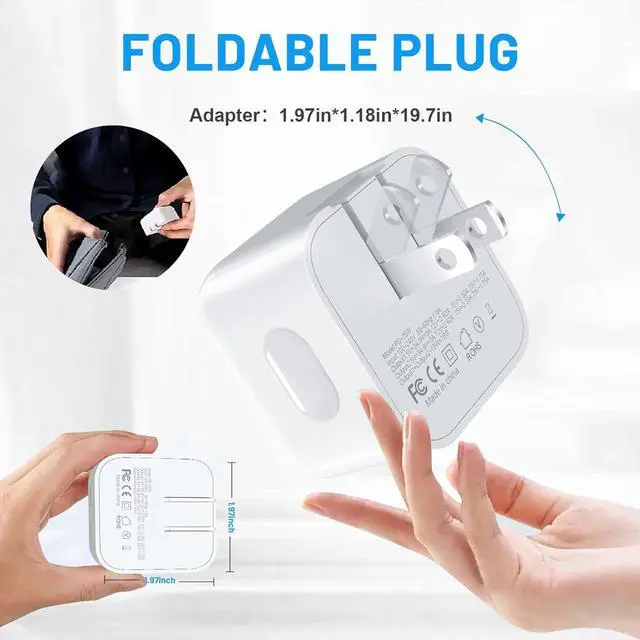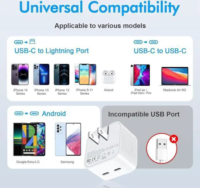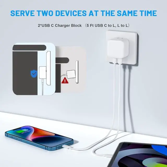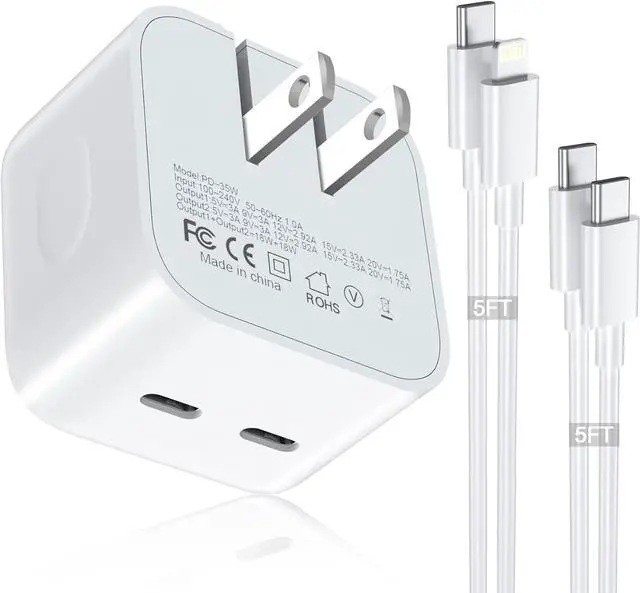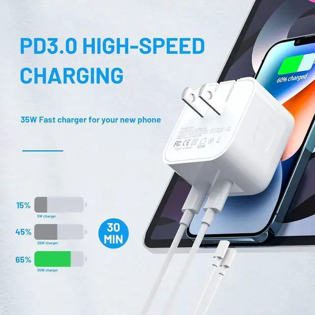 Universal Compatibility 35W USB C wall charger plug to fast charge for iPhone 14/14 Plus/14 Pro/14 Pro Max/13/13 Mini/13 Pro/13 Pro Max//12/12Pro/12 Pro Max/12 Mini/11/11 Pro/11 Pro Max/XS Max/XS/ X/XR/8 Plus/8, iPad Pro/ iPad Air/iPad Mini/ iPad, MacBook Air. Standard Charging Speed works with iPhone 7/7 Plus/6s/6s Plus/6/6 Plus/SE/5s/5/5c. (include 2Pack 5FT Charging Cord C to L, C to C )