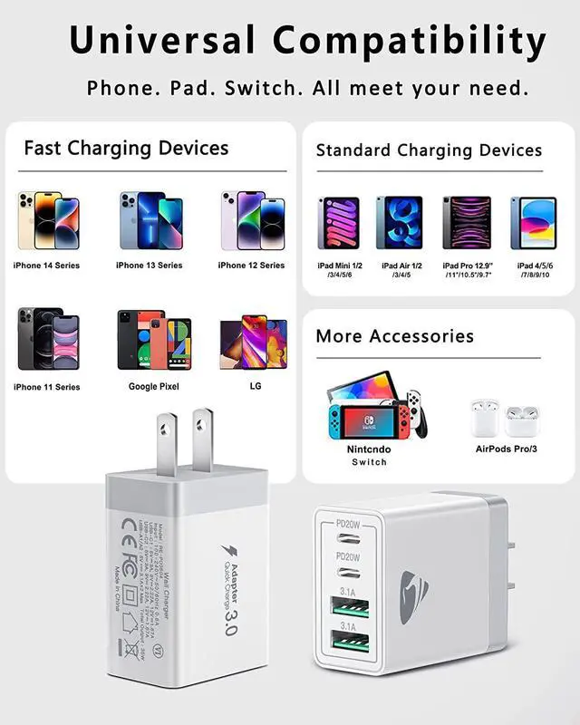 Universal Compatibility: Due to the special 4-port, the USB charger is compatible with almost all electronic devices, charging adapter for iPhone 14/14 Pro/14 Pro Max/13/13 Mini/13 Pro Max/12/12 Pro Max/12 Pro Max/12 Mini/SE 2020/11/11 Pro/11 Pro Max/XR/XS/X/8/7, iPad Air/Pro/Mini, Samsung Galaxy S22/S21/S20/S10/S9/S8/A12/A13/A22/A32/A52/A53/A71/Note 20 10, Tablets, LG, Motorola, Google Pixel and other digital devices compatible.