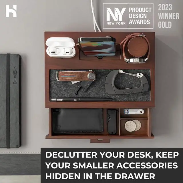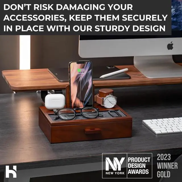 A NEW HOME FOR YOUR DEVICES Keep your essentials in order and always within reach. This nightstand organizer for men includes a smartphone and earbuds charger holder, compatible with all phone and earbud models. This makes it a perfect gift for men. Unlike other mens nightstand organizers, the watch posts sturdy design keeps your watch securely in place. Store everything else on the felt-lined tray and in the drawer.