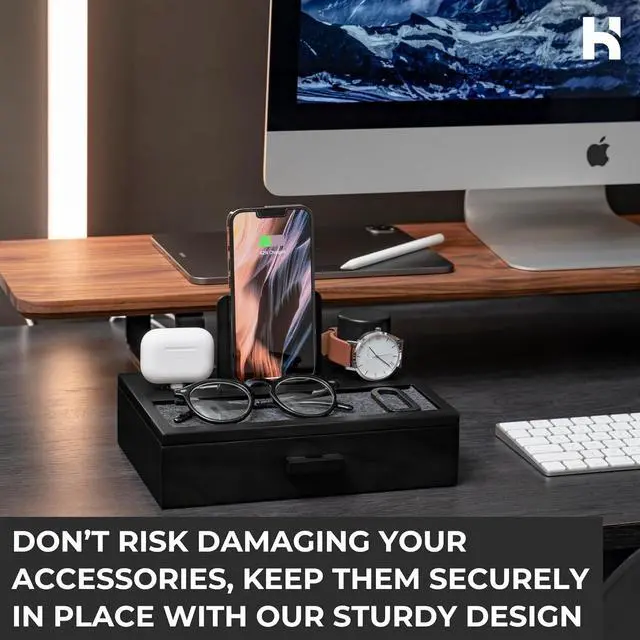 A NEW HOME FOR YOUR DEVICES Keep your essentials in order and always within reach. This nightstand organizer for men includes a smartphone and earbuds charger holder, compatible with all phone and earbud models. This makes it a perfect gift for men. Unlike other mens nightstand organizers, the watch posts sturdy design keeps your watch securely in place. Store everything else on the felt-lined tray and in the drawer.