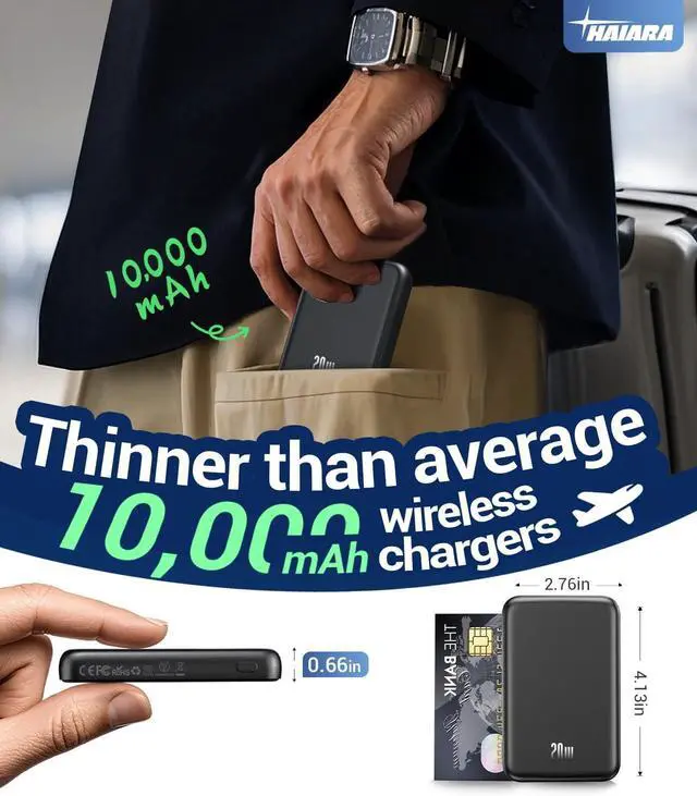Card Size: At just 0.66 -inch thickness (20% slimmer than average 10 000mAh wireless chargers) and 4.09 × 2.72 -inch credit card dimensions this 0.41 lb portable charger power bank fits effortlessly in pockets or small bagsideal for airport security lines and daily carry. 15W Wireless + 20W USB-C Fast Charging + 10000mah