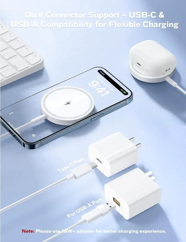 The design is a masterclass in minimalist elegance featuring sleek flowing lines and a striking lightning bolt logo that exude understated sophistication. Ditching the bulky stereotype of traditional chargers it boasts an ultra-thin profile-just 7mm thick and weighing only 45g. Advanced Heat Dissipation | Multi-ProtectionEquipped with advanced heat dissipation technology and multi-protection features ensures that your stays safe during charging. Built-in charging intelligent chip supports five-fold protections: over-current over-voltage over-temperature short-circuit and foreign object detection. Auto-cut off when fully charged to eliminate risks of bulging or overheatingDual Ports + Long CableFlexible UsageTired of adapter hassles or short cables? Our magnetic wireless charger features a 3.96 ft cable and both Type-C & USB-A compatibility (with a handy Type-C to A connector). Plug into any power source and start charging stretch out on the couch work at your desk or relax in bed charge freely. Fast Mag ChargingPowerful & EfficientWith a fast magnetic charging capability(need 18W/20W or higher adapter not included) our charger delivers fast and efficient power to you so you get peak performance whether topping up during a coffee break or overnight charging.