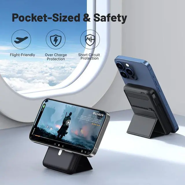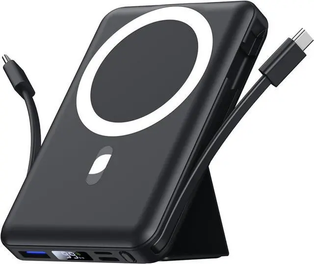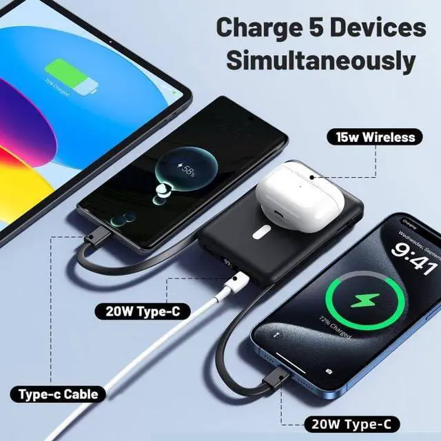 Strong Magnetic & Suitable for a Wide Range of DevicesThe portable wireless charger with the newest magnetic technology can directly hold the back of your iPhone: iPhone 16 iPhone 16 Plus iPhone 16 Pro iPhone 16 Pro Max iPhone 15 iPhone 15 Plus iPhone 15 Pro iPhone 15 Pro Max iPhone 14 iPhone 14 Plus iPhone 14 Pro iPhone 14 Pro Max iPhone 13 iPhone 13 mini iPhone 13 Pro iPhone 13 Pro Max iPhone 12 iPhone 12 mini iPhone 12 Pro and iPhone 12 Pro Max. Built-in TWO Cables & Foldable StandThe portable travel charger for iphone has built-in USB C charging cables perfectly compatible with iPhone or Type-C devices no need to carry extra cables; The Magnetic Wireless Portable Charger Features a versatile built-in foldable kickstand can replace mobile phone stand that keeps your iPhone15/14/13/12 upright for a comfortable viewing angle. 5 Devices Charging SimultaneouslyThe magnetic power bank for iphone supports up to 15W wireless charging; USB-C PD output up to 20W; up to 22.5W USB PD; supports up to 12W Lighting input and up to 20W USB-C input; supports charging up to 5 devices at the same time shared charging with no waiting. Superior SafetyHigh-density lithium polymer battery with 8 built-in low-temperature ice cores this latest Azmuth magnetic portable charger has comprehensive multi protect safety system specifically includes temperature control overcharge protection short circuit protection; Multi-Protect safety system ensures that your devices are shielded from potential hazards providing you with a worry-free charging experience10000mAh Capacity & Smart LED Display10000mAh Magnetic wireless power bank large capacity can provide long time power need providing enough power for your device when you are outdoor trips camping hiking or other active without worrying about insufficient power; you can clearly see the exact remaining power electricity on the LED screen of the power bank for mag safe wireless charging symbol and the green PD fast charging symbol without guessing the remaining power electricity level.