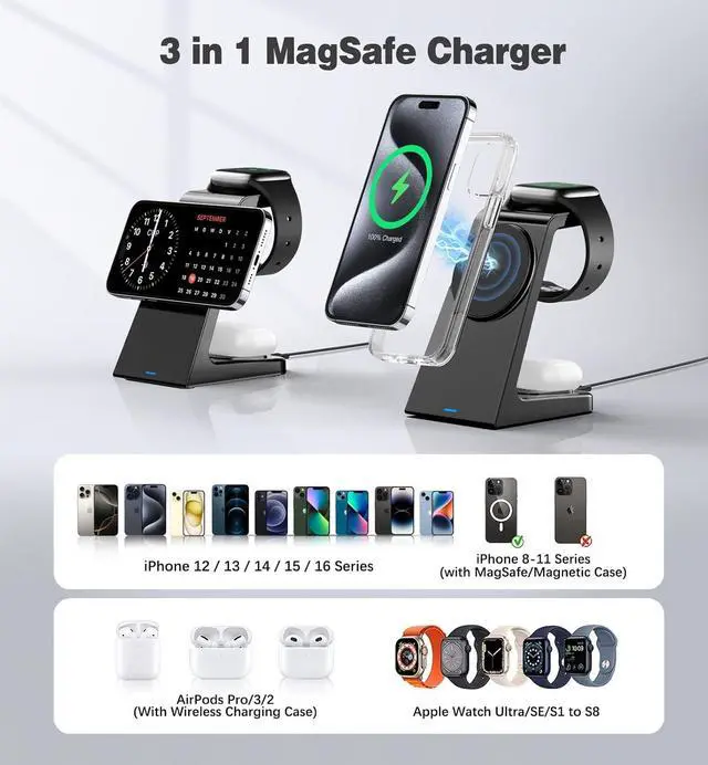The mag-safe stand is compatible with iPhone 16 16 Pro 16 Plus 16 Pro Max 15 15 Pro 15 Plus 15 Pro Max iPhone 14 14 Pro 14 Plus 14 Pro Max iPhone 13 13 Pro 13 Pro Max 13 Mini and iPhone 12 12 Pro 12 Pro Max 12 mini and AirPods 3 Pro 2 and Pro. This 3 in 1 charging station is perfect for tech-savvy enthusiasts who value efficiency and simplicity.???????????????????????????????????????????????????????????????? The 3 in 1 mag-safe charger station has passed thousands of tests in our lab.