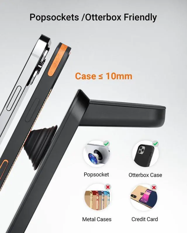 Wireless Charging Compatible: Wireless charger for thick cases is designed to work through most thick phone cases and grips up to 3.9 inches (10 mm) including PopSockets OtterBox heavy duty case and loopy case. It is convenient to charge your phone without taking off your pop socket case or grip. Compatible with silicone TPU PC and carbon cases (Please remove the magnetic or metal accessory from the phone case while charging. )Vertical or Horizontal
