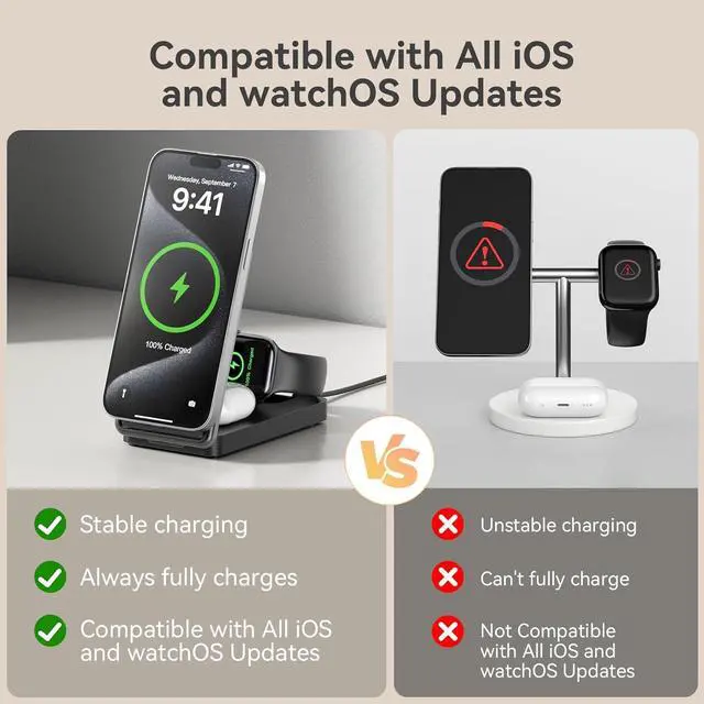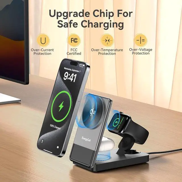 Best Choice for Multi-Devices Get the 3-in-1 foldable magnetic wireless charger to fuel your iPhone iWatch and Airpods at once so you no longer have to juggle multiple cords and adapters or finding enough outlets to charge all your devices making it a portable & time-saving charging solution for travelers and commuters. Officially Qi2 CertificatedThe wireless charger stand is Qi2 certified providing safer and more reliable charging at faster speed. Also with its smart protection technology overvoltage protection short circuit protection overcurrent protection temperature control your devices are safeguarded while enjoying fast and efficient charging. Ultra Fast ChargingThe 3 in 1 charging stand delivers 15W max fast charging for iPhone fast charging for AirPods and iWatch.