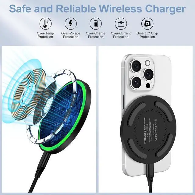 Wireless Charger: The wireless charger fast charging Pad support 4 kinds of output power schemes: 15W/10W/ 7.5W /5W. Different devices will automatically adapt to different output powers maximum output power of the 15w fast wireless charger for Pixel 8 a/8Pro/7/7a/6 10W fast wireless charger pad for Galaxy S24 Ultra/S23/S22/S21/S20 wireless charger station provide 7.5W output for iPhone 16/15/14/13/12 android wireless charger allows you to charge your device at a higher charging speed which up to 2x faster than standard cordless charger. Multiple Protections &