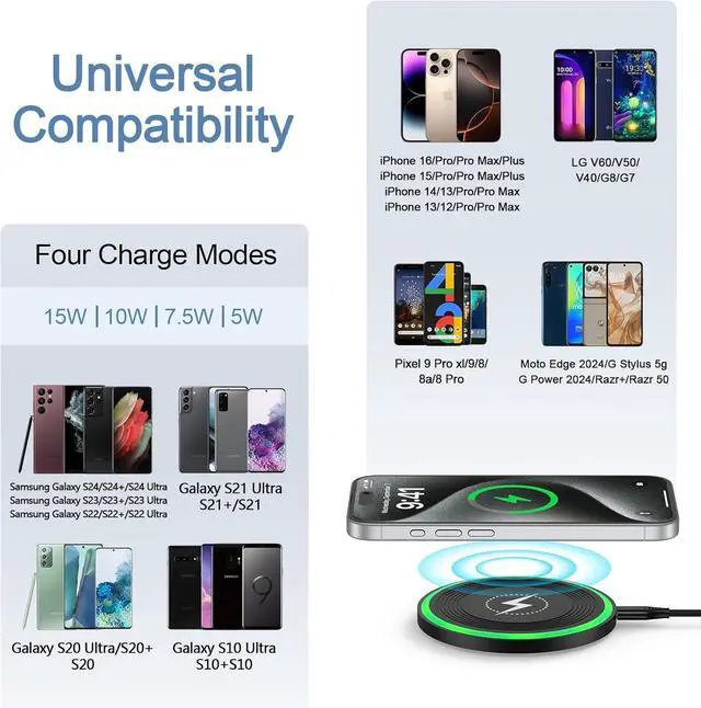 Wide Compatibility: Wireless fast charging station for Galaxy S25 Ultra/S24 Ultra/S24 FE/S24 Plus/S23 Ultra/S23+/S22/S22+/S22 Ultra/S21 Plus/S21 FE/Note 20/S10/S10+/Z Fold 6/Z Flip 6/5/Note 20 Ultra/10/9/S9/S8/S7/S6 Edge+ Motorola Edge 2024 Edge 50 Ultra G Power 2025/2024 G Stylus 5G 2024 X50 Ultra Razr 50 Ultra Razr 40 Ultra iPhone 16/16 Pro/16 Plus/16 Pro Max/15/15 Plus/15 Pro Max/14/14 Plus/14 Pro Max/12/13 Pro Max/12/12 Pro Max Google Pixel 9/8a/8/8 Pro/7/7a/7 Pro/6 Pro/6/5/5XL/4/4XL/3/3XL LG V60/V50 /V40/G8/G7 and more. Non-slip Design &