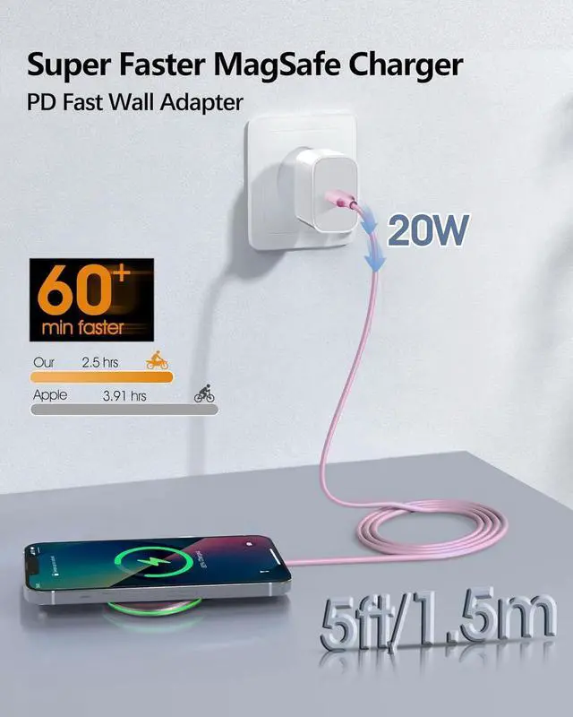 Note: Please use the Mag-Safe case for stronger magnetization regular cases will weaken the magnetic adsorption.? Package Not Included Charger Adapter.?? Magnetic Alignment and Strong AdsorptionMag-Safe wireless charger relies on N52 strong magnets to automatically align the magnetic phone charger to the best position and secure your phone. While your iPhone is charging you're free to work play games watch movies listen to music or do anything else you might need to do.?? 15W Fast Magnetic Safe ChargingEngineer testing shows that it only takes 2 hours to charge iPhone from 0 to 100% and it can charge iPhone 14 to 50% in half an hour which is three times faster than the original 5W iPhone charger. Our wireless charger has passed FCC RoHS and UL certification requirements to ensure fast magnetic and safe charging.?? 5ft/ 1.5 m