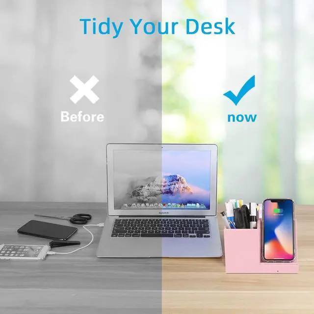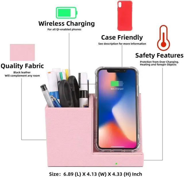 Note: The thickness of the phone case must be less than 0.2 inches (5 mm) before it can be charged normally on this stand. Suitable for Multi OccasionsIt's perfect to hold all the pens pencils scissors cell phone note paper cards etc. Make it easy to tidy the clutter on your desk. Great ideal for corporate meeting rooms classrooms restaurants hotels and Living room with Multifunctional Wireless Charger and to keep all neat anywhere. Safety ProtectionBuilt-in temperature protection and short circuit protection features ensure the safety of your device during the entire charging process.
