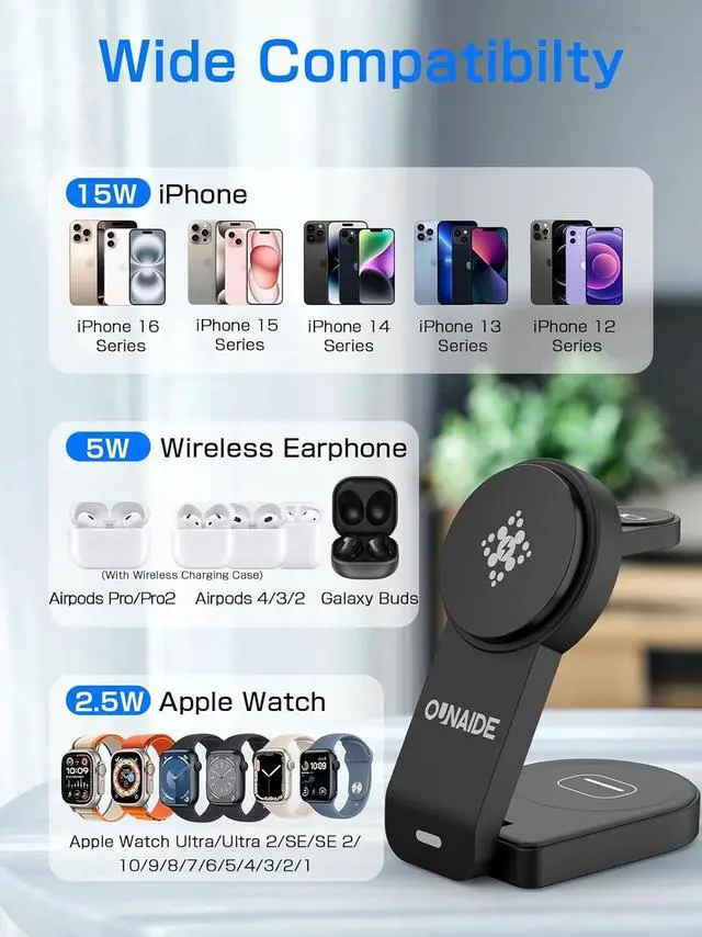 Fast 2.5 -hour charging ensures you stay powered throughout your dayFoldable & Travel-Ready Charger Stand --- Designed for portability and everyday convenience this travel charger for multiple devices features a upgraded foldable design. Transform it into a solid charger stand with three adjustable angles. Whether you're watching videos working or on the go this wireless phone charger stand supports both portrait and landscape modes making it a perfect cell phone charger stand and charging station for home office or travelSmart Charging for Daily Use --- Equipped with intelligent protection technology this iphone wireless charger prevents overvoltage overheating and overcurrent.