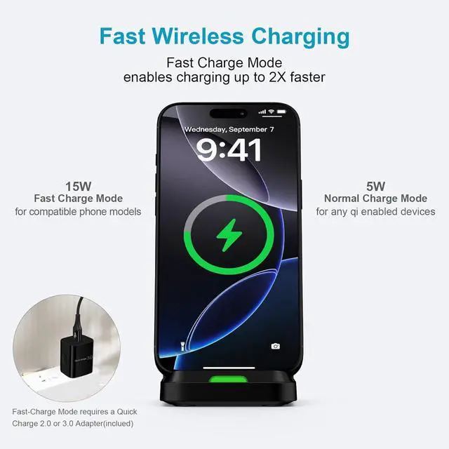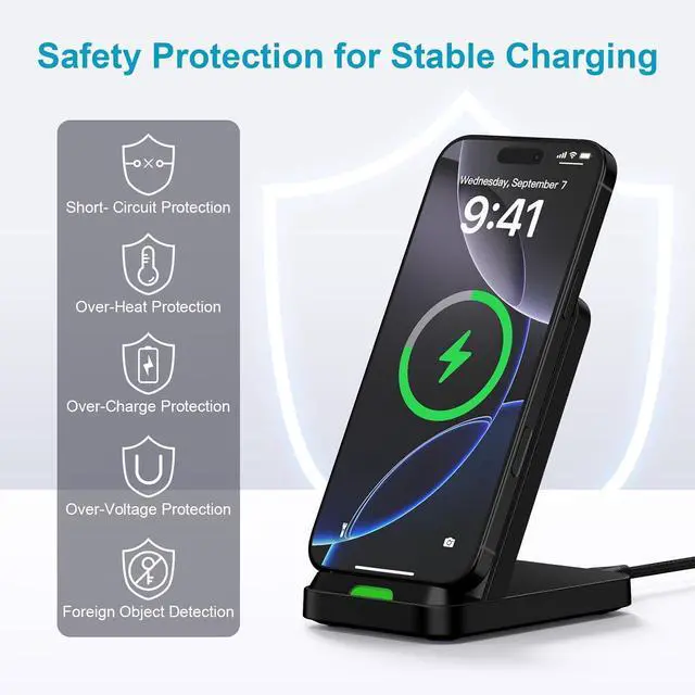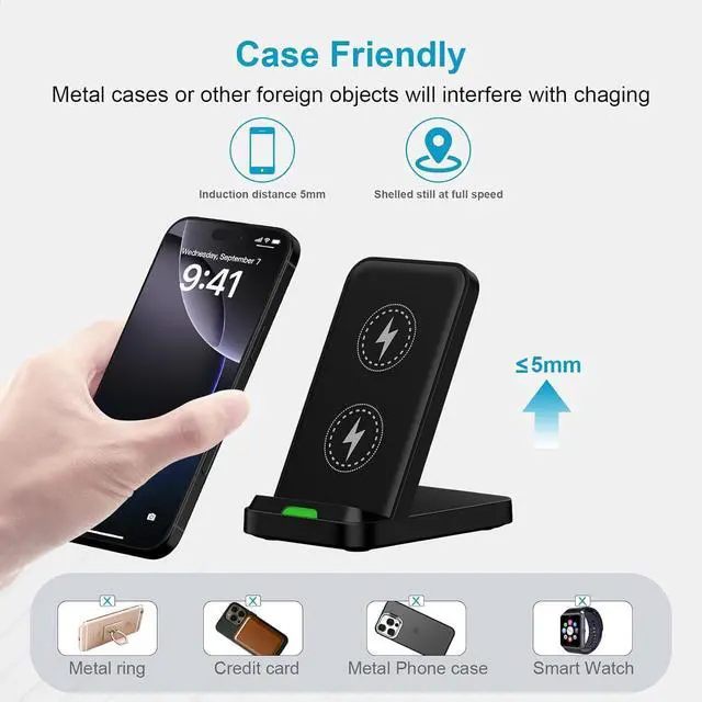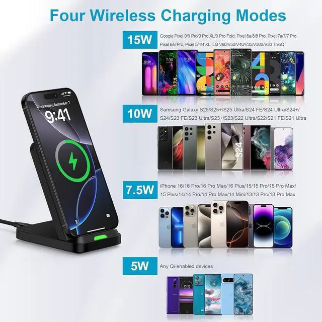4 Charging Models15W compatible with Pixel 9/9 Pro/9 Pro XL/9 Pro XL Fold/8a/8 Pro/8/7a/7/7 Pro/6 Pro/6/5/4 XL/LG V60/V50/V40/V35/V30/G8/G7; 10W compatible with S25/S25 Ultra/S25+/S24/S24 Ultra/S24 FE/S23 Ultra/S23/S23+/S22/S22 Ultra/S21/S20/S10/S10E/S9/S8+/Note 20/Z Flip5/Fold5; 7.5W compatible with for iPhone 16/16 Pro/16 Pro Max/16 Plus/15/15 Pro/15 Pro Max/15 Plus/14/14 Plus/14 Pro/14 Pro Max/13/13 Pro/13 Pro Max/12 with latest iOS System; and 5W for any wireless-charging-enabled phonesEasy ChargingThe two-coil design offers a wider charging area than a general round wireless charging pad while eliminating the hassle of finding the 'Sweet Spot' It supports charging vertically or horizontally providing the perfect angle for your eyes so you can watch movies listen to music make phone calls or send messages without interruption throughout the charging processSmart LED IndicatorsThe intelligent LED indicator shows the charging status helping you to know the status of the wireless charger directly.