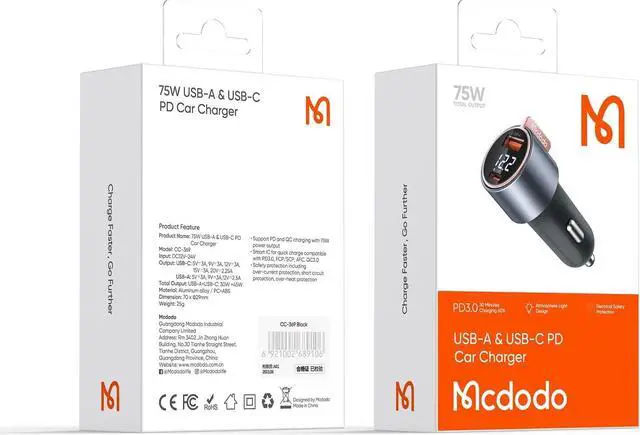 Dual-port USB-A/USB-C PD fast charging: A+C car charger 75W Max Charging at the same time without slowing down the two ports have independent circuits the dual ports have independent flow control chips and PD fast charging is enabled at the same time. Compatible with PPS/PD 3.0 /QC 4.0 +/QC 3.0 /AFC/FCP and other fast charging protocols USB-C PD 45 W; USB-A PD 30 W supports MacBook Pro/Air/ i Pad/ and any Type-c interface device also support car vacuum cleaners driving recorders and other devices. Fully charged when you get off the car: Mcdodo Car Charger dual-port lightning fast charging fully charged for travel suitable for / 45W simultaneous fast charging S211 charges about 56% in 30 minutes; iPhone 14 charges about 60% in 30 minutes. Mobile phones and laptops also charge quickly with the MacBook 16 charging about 41% in 30 minutes. Don't worry about long-distance charging protect your equipment from being overcharged and trickle down the charge.