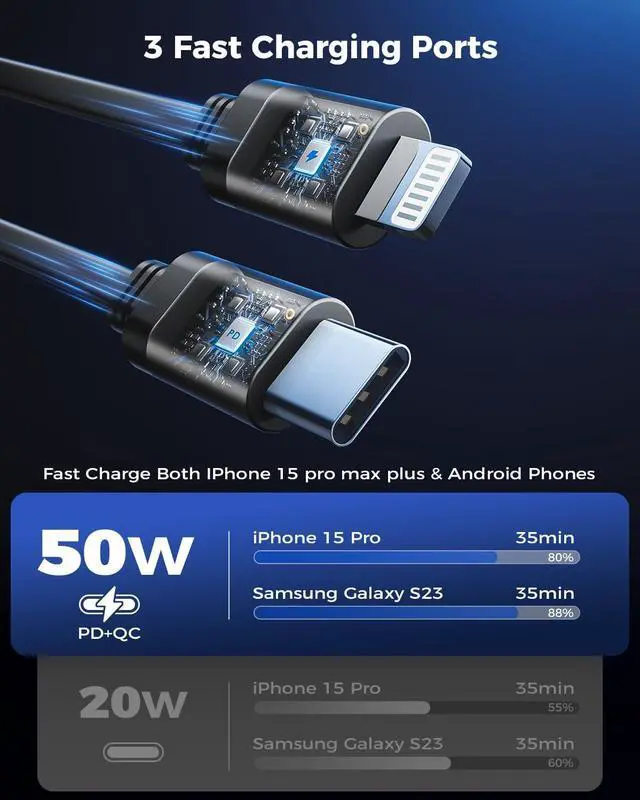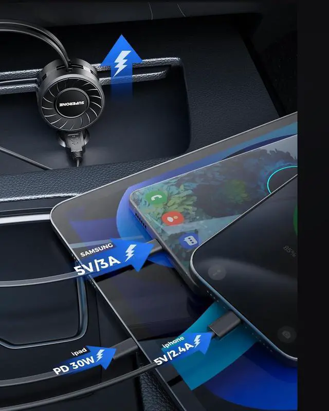 30 W charging power while the USB-A and lightning port deliver up to 20W. So you can charge 3 devices at the same time and at high speed.?????????????????????????? ---With retractable type-C & lightning cables and USB-A port this fast charging car phone charger supports fast charging for up to three devices simultaneously. No more carrying multiple car chargers for different devices C it's a versatile solution for your charging needs.