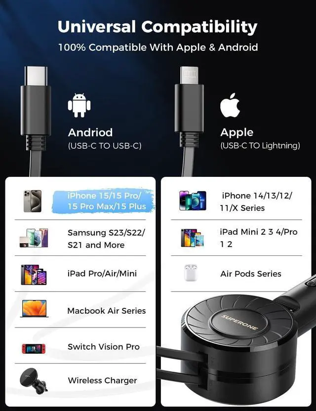 Additionally the USB-A port serves as an emergency alternative ensuring continuous charging even when retractable cables might not be compatible. Stay charged and connectedyour ultimate solution on the go!???? -???????????????????????????????????????? ---If this retractable car charger for iPhone is not compatible with your cars please feel free to contact us and we will help you solve the problem asap.
