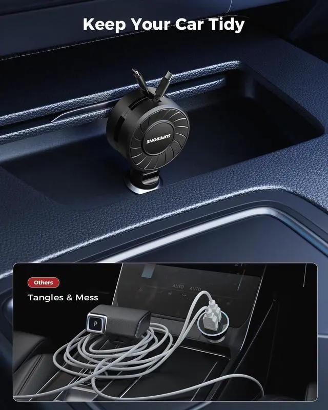 ?????????????????????????????????????????? ---Featuring a retractable design this retractable phone charger comes with two 80cm retractable phone charger cords that automatically retract for easy storage. Say goodbye to cable entanglement and keep your car interior well organized.???????????????????????? ---This fast charge retractable car charger can be used for both 12V DC and 24V DC loaded with 50W of output power in total the Type-C port offers max.