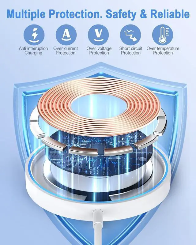 Safety & ReliableWireless charger is made of high-quality materials and advanced Mag Safe magnetic coil, provide multiple intelligent protection. The intelligent charging technology safeguards against overcharging, overheating, and short circuits, ensuring the longevity of both the charger and your devices. The safety features and certifications making charging hassle-free.