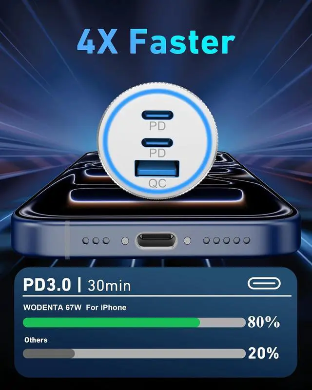 Super Fast Charging: USB C super fast car charger with all-new upgrade 67W can charge for iPhone 17/16/15 series up to 80% and iPad up to 60% at 30 minutes. Type C car charger adapter also fast charge for Galaxy S25/S24/S23 series up to 60% in just 20 minutes3-Port