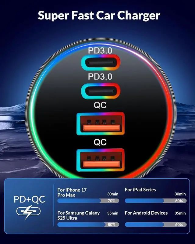 Fast Charging for iPhone 17/16/15: Car phone charger with [2025] upgraded PD/PPS/QC fast charging technology 90W Power charging for iPhone/iPad/Mac Book/Android Devices. Charge for iPhone 17/16/15 up to 70% and iPad series up to 60% in just 30 minutes. And charge for Galaxy S25/S24 series up to 80% and most Android devices up to 60% in 35 minutesWidely