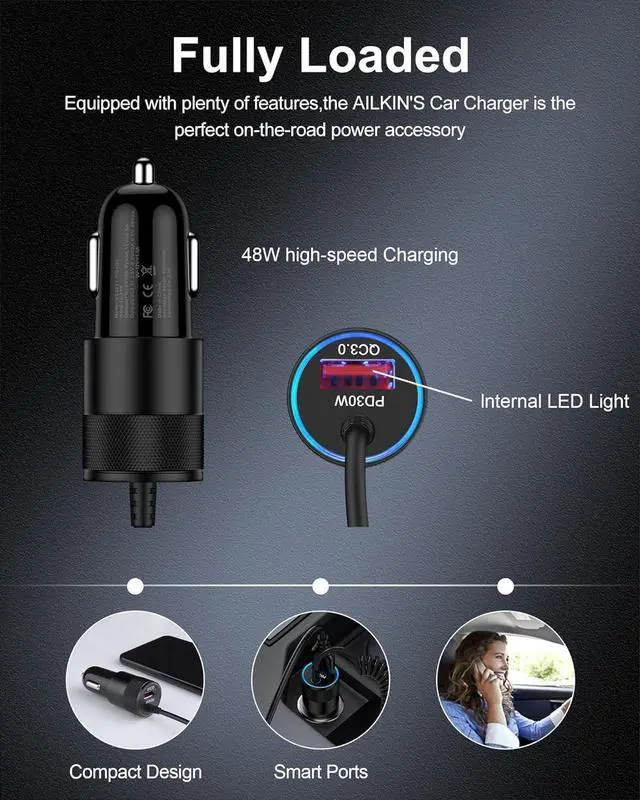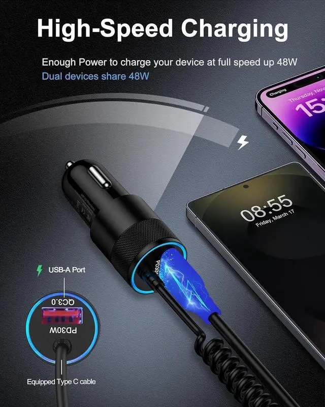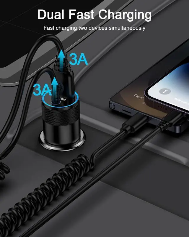 48W Fast Charging Car Charger with Built-in Coiled Cable Compact car charger with an integrated coiled USB-C cable (extendable up to 3ft) delivers stable 30W PD output perfect for powering your latest iPhone 17 16 series S25 Pixel 10 and more. Dual USB-C & A Output 48W Total Features one built-in 30W USB-C cable and one 18W QC USB-A port allowing you to charge two devices at the same time quickly and efficiently. Wide Compatibility USBC Cable and Quick USB outlet Works fast and seamlessly with iPhone 17 Pro Max/17Pro/17/Air/16e/16 Pro Max/16 Pro/16 Plus/15 Series Galaxy S25/S24/S23 Ultra/Note 20/Z Flip 7/Z Fold 7 Google Pixel 10 Pro/10/9 Pro XL/9 iPad Pro/Air/Mini and more USB-C smartphones tablets and accessories its the ultimate travel essential for any car truck or SUV.