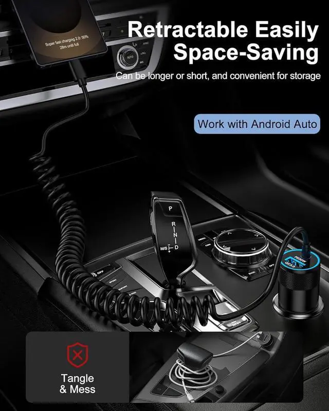 Coiled Cable for Tangle-Free Use The iPhone 17/16e Car Lighter Adapter features a retractable design providing a space-saving solution that keeps your car clutter-free. The coiled cable stretches when needed and retracts automatically making it convenient for drivers and passengers. Safe & Reliable Android Car Adaptor This Car Charger is equipped with advanced safety features including over-current over-voltage temperature control and short-circuit protection to ensure worry-free charging during every drive.