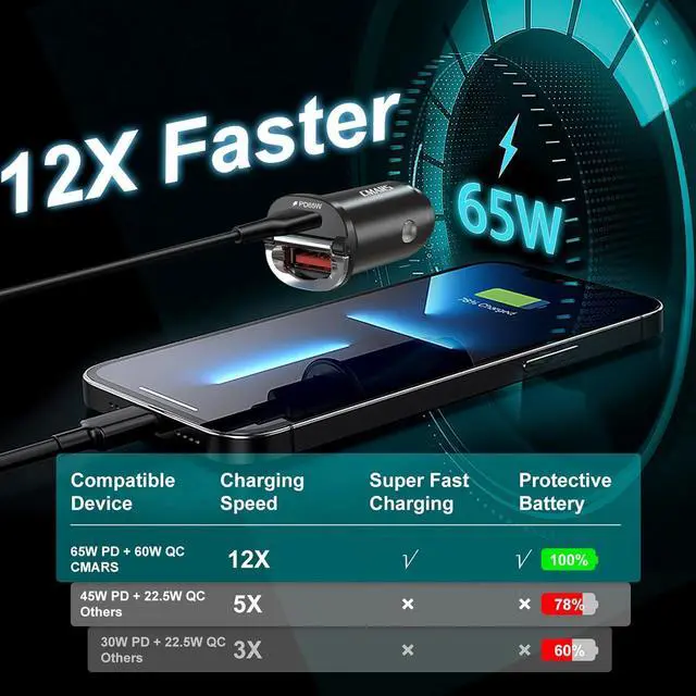 Multiple Certification Safety: Cmars cigarette lighter usb charger Certified by CE/FCC/ROHS. Built-in smart chip provides multiple safety protections including Over-temperature Over-charging Over-current Over-voltage Short-circuit and flame retardant protections. The cargador para carro intelligent temperature control maintains optimal operating heat. Auto-switches to trickle charging at 80% to reduce battery strainHigh-Speed