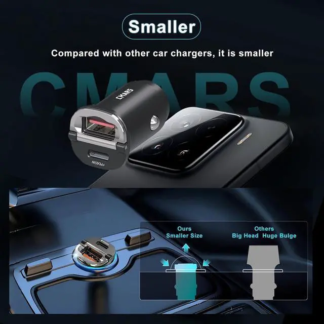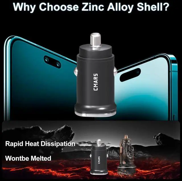 Alloy Casing: Cmars car lighter usb adapter--Constructed with premium zinc alloy. Resists melting more exquisite and beautiful and provides superior heat dissipation compared to plastic. At the same time usb c car adapter superior thermal conductivity ensures efficient heat dissipation for sustained safety and stability during high-power fast chargingCompact