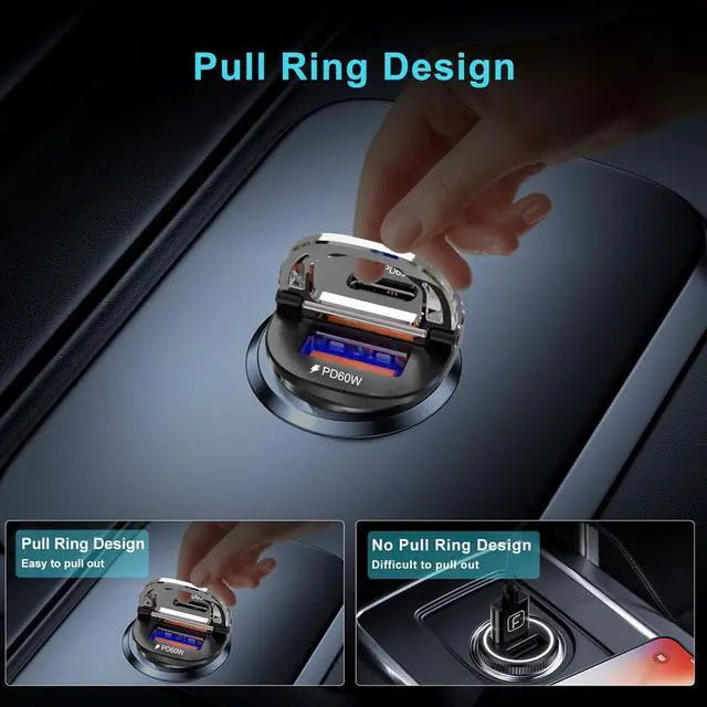 Pull Ring Design: With a compact and exquisite design It does not protrude too much after being inserted into the cigarette lighter simple and beautiful simple and beautiful and not easy to touch. The cigarette lighter charger uniquely designed pull ring is not only convenient for insertion/removal but also adds practicality and designAnti-Slip