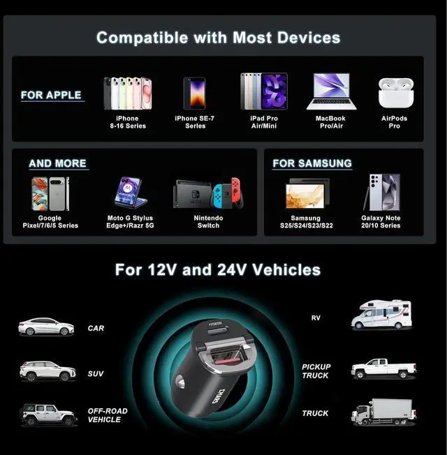 Series and More: for Google Pixel/7/6/5 Series Moto G Stylus/Edge+/Razr 5G Nintendo Switch etc. This car usb charger for 12v~24V Off-Road Vehicle/Car/SUV/Truck/Pickup Truck/RVsSupport Fast