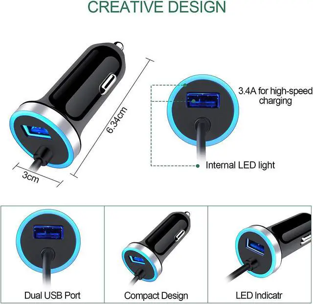 Output: DC 5V/ 3.4A (Shared by 2 Ports). This convenient Dual Port USB Car Plug high-speed charge two devices at same time maximize the charging efficiency 50% faster than other car charger. With the Internal LED light it more convenient for you to pull and plug USB cable in dim light and allow you pull out this car adapter from car cigarette lighter power socket plug outlet more easy.