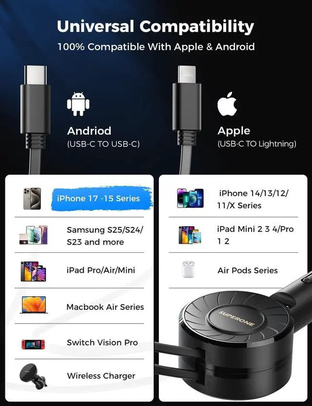 Additionally the USB-A port serves as an emergency alternative ensuring continuous charging even when retractable cables might not be compatible. Stay charged and connectedyour ultimate solution on the go!???? -???????????????????????????????????????? ---If superone retractable car charger is not compatible with your cars please feel free to contact us and we will help you solve the problem asap.