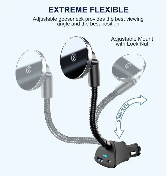 ? 15W Fast Charging For iPhone 17/16/15/14/13/12 SeriesThe mag-safe Car cigarette lighter phone charger is specially designed for iPhone 17/16/15/15 Pro/15 Mini/15 Pro Max/14/14 Pro/14 Mini/14 Pro Max/13/13 Pro/13 Mini/13 Pro Max/iPhone 12 Series Just place your iPhone 13/12 against the mag-safe car mount it will auto-lock aligned with the charging coil to max 15W fast charging.? 38W Power Delivery Dual Port Phone MountEquipped with dual-port car charger mount-USB A (QC 3.0 ) and USB C (PD 3.0 ) supporting PD 20W (Max) and QC 18W (Max) high power delivery can fast charge two devices simultaneously.? One-Click ReleaseEnjoy the convenience of one-click operation for easy phone placement and removal.