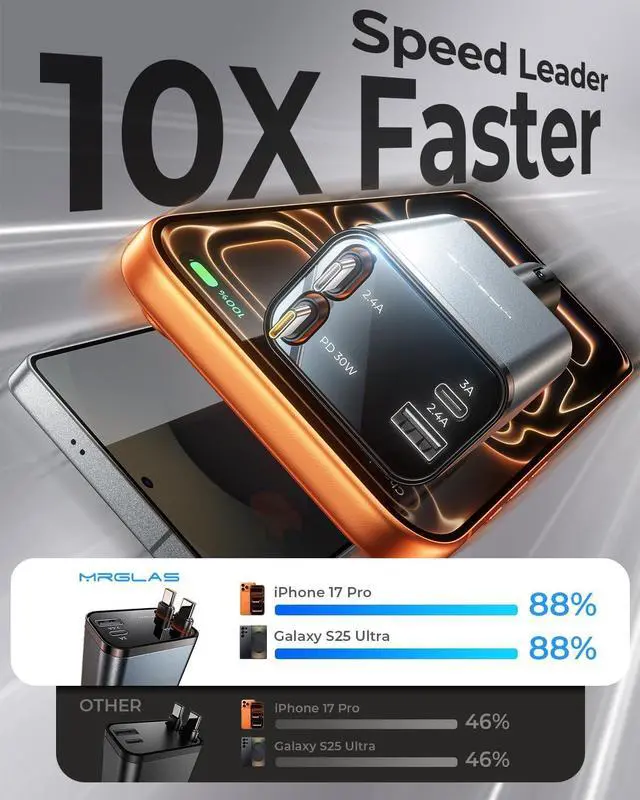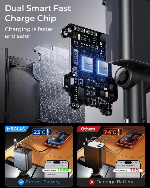 Retractable Cables: Say goodbye to cable clutter with MRGLAS retractable car charger. This car fast charger integrates two built-in retractable USB-C cables with secure magnetic storage always keeping your car interior neat and organized whether in use or after used. The dual cables are tested to endure over 10 000 smooth pulls and retractions built to last and accompany your every journey with reliability and peace of mind180°