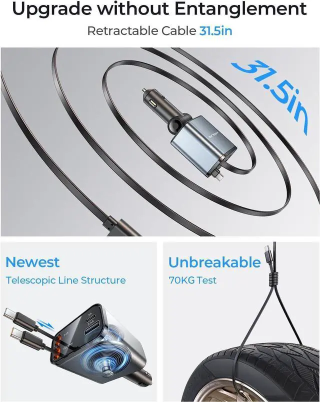 Devices Simultaneously: This super fast car charger features an advanced power allocation system delivering 30W high-power single USB-C output while sharing 30W across three extra ports (2 USB-C + 1 USB-A). Charge your laptop fast while keeping other devices powered and ready to go. What a smart and compact retractable car charger 5.9 × 2.64 × 1.38B uilt-in Dual 31.5 -Inch