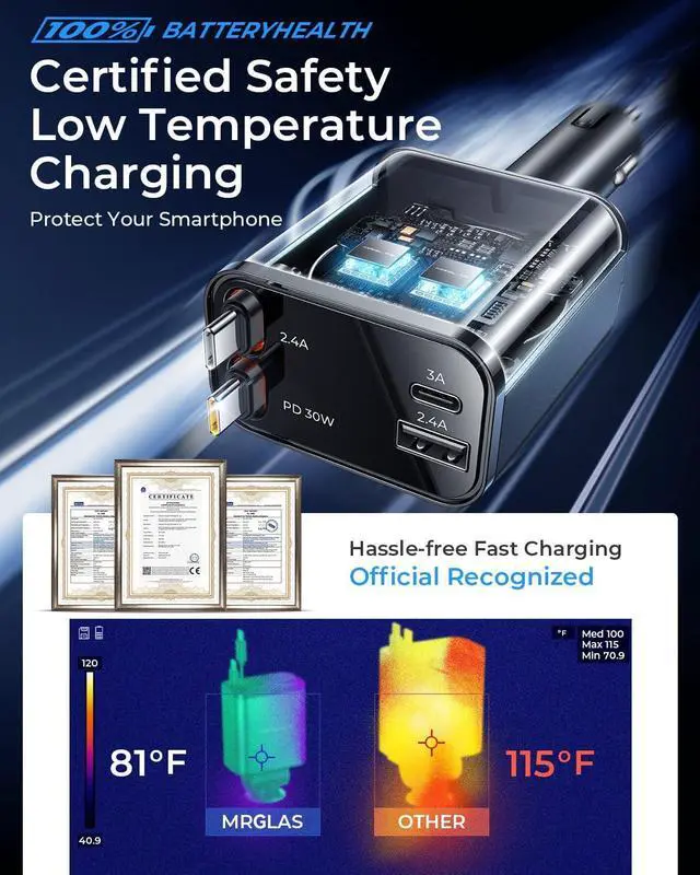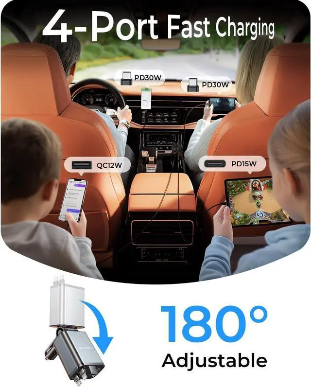 Retractable Car Charger: Experience lightning-fast charging for seamless office work on the go. Designed to support high-power devices such as laptops tablets and smartphones this fast charging car charger ensures your road trips and daily commutes hassle-free. It includes a 30W USB-C1 cable output a 30W USB-C2 cable output a 15W USB-C3 port output and a 12W USB-A port outputCharge 4