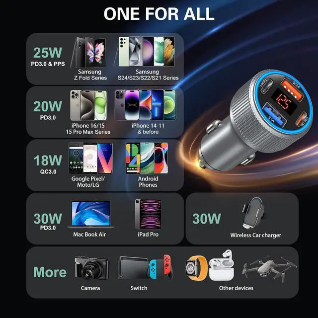 [Wide Compatible] Wide range from dc 12V-24V (6A) the 12 volt usb c car charger outlet works great with smart phones tablets wireless car charger dash cams usb fans and other usbc and usb car accessories. Fast charge compatible with iPhone 16/15/14/13/12/11 Pro Max/Plus/Mimi; Pad Pro/Mini; iPhone XR/SE/XR/Xs/Xs Max/8/7 Plus Galaxy S24/S23/S22/21/S20/S10/S9/S8+ Note 20/10/9/8 A03S 5G/A13/A14/A15/A53/A54/A71; Motor L G phones driving recorder GPS navigation car vacuum cleaner power banks and other devices. [Safe and Reliable Cigarette Lighter] Made of full aluminum alloy the metal car charger is more sturdy and safety than the plastic ones.
