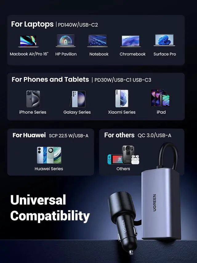 Total Output: Supports up to 150W total output and PD 140W via USB C2 port fast charging MacBook Pro 16 from 0% to 50% in just 30 minutes and iPhone 15 in 30 minutes4-IN-1 Fast Car