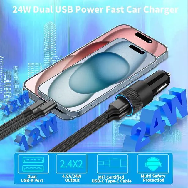 Dynamic Temperature Sensor: Certified by MFi UL ETL FCC CE ROHS. Equipped with Braveridge's all-new Intelligent temperature control system to provide over-current over-voltage over-heating and short-circuit protection Automatically detects and delivers the optimal charging output for iPhone 17 ensuring safe charge. Features a Dynamic Temperature Sensor which actively monitors temperature and a Power Tuner Chip which adjusts power output to safeguard your connected iPhone 17 device. 4.8A Dual USB Cigarette Lighter Fast Car Charger for iPhone 17: Equipped with 4.8A dual power output Braveridge's fast car charger can charging two iPhone 17 devices simultaneously. The built-in Intelligent-IC chip automatically detects and provides the best power for your iPhone 17 devices. Provide a maximum of 2.4A /12W if a single port is used and 4.8A /24W when dual ports are used simultaneously. Can charge your iPhone 17 device 5 times faster Charging efficiency is improved by 80%.