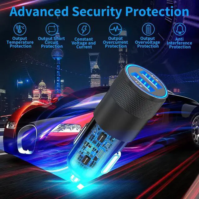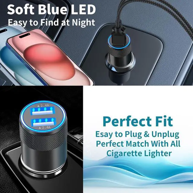 Premium Materials and Design: The housing made of an aluminum alloy + ABS fireproof materials offers better scratch resistance heat dissipation attractive design and long service life suitable for the most untouched vehicle interiors. Gold-plated tubing reduces heat during charging while maximizing charging speed and efficiency. The ring blue LED indicator can help you to find the charging ports easily in the dark Easily fits in a car cigarette Lighter socket with limited space.
