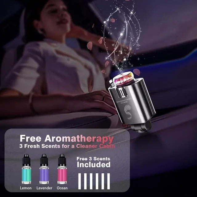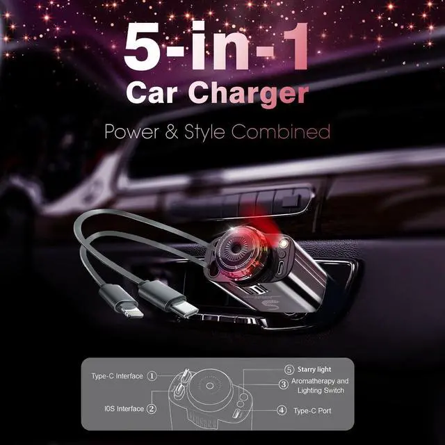 [Tangle-Free Car Organization] Retractable cables and compact design save space keeping your car interior clean and clutter-freeno more messy wires or bulky adapters. [Smart Safety for Every Device] Advanced protection against overcharging overheating and short circuits. Intelligent monitoring regulates power flow while thermal sensors maintain safe temperatures. With industrial-grade surge protection it prevents electrical hazards keeping your devices safe during every charge. Professional-grade securit. [Perfect Gift for Drivers & Travelers] Combines practicality (fast charging) with luxury (aromatherapy starlight) in sleek black. Not only is it an essential item for road trips and daily use but it also makes an ideal choice for holiday gifts (birthday gifts Thanksgiving gifts Christmas gifts).