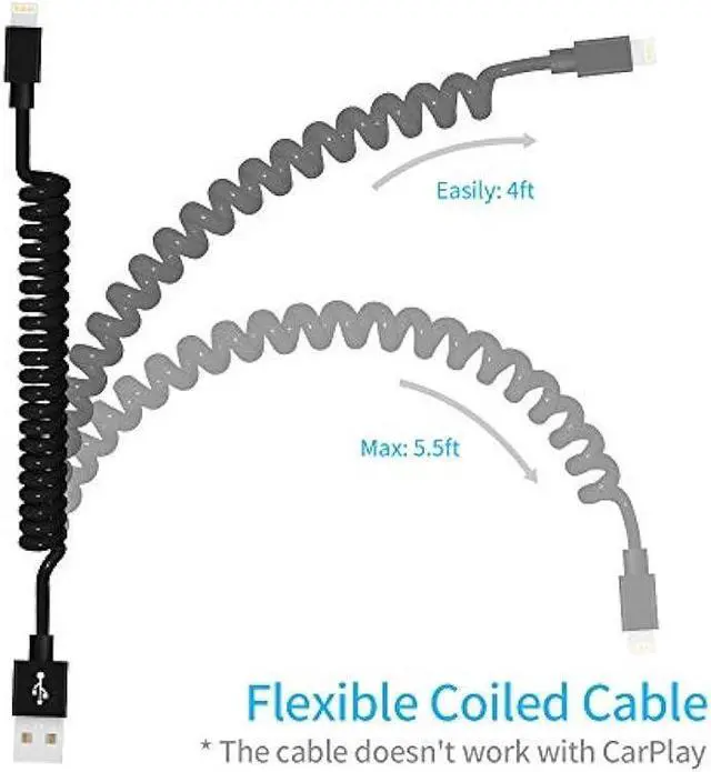 [Easy to Stretch]: Made from upgraded soft material, stretch easily. The cable can extend to 5.5 ft when pulled tightly, and its optimum straight-end length will be about 4ft, long enough for in-car use. (Note: The cable doesn't work with CarPlay. )