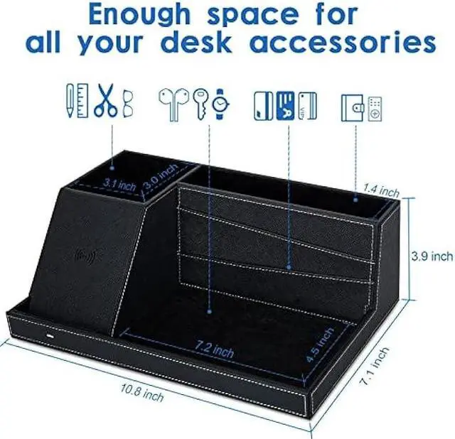 MULTI-FUNCTIONAL ORGANIZER SUITABLE FOR DIFFERENT OCCATIONS: This desk organizer with phone charger is well made and nice looking, designed to keep your desk accessories well organized and also nice for dressers, nightstands, desk and table-tops. Use in your living room, bedroom, home, office, etc. It's just SUPER nice to have a wireless charger on your desk and keep all things in order at the same time.