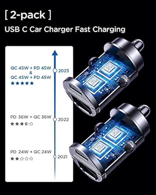 ABOUT 2 PACK CAR CHARGER: Get 2 of the same car charger at once with USB A (45W) port and USB C (PD45W) port. This is a great choice as gift for friends and family who have 2 cars. Smart people always prepare 1 extra car charger as an alternative, 2 packs can give you a sense of security.