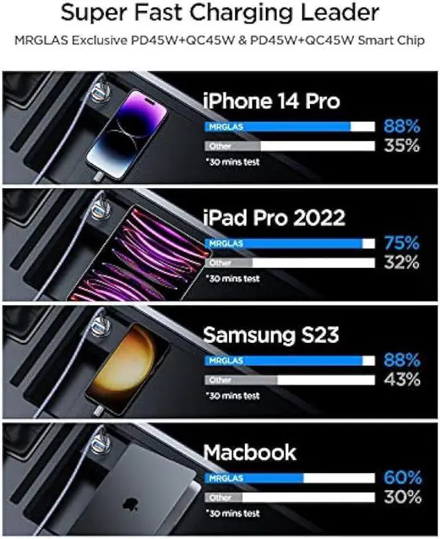 OFFICIALLY APPROVED PD45W+QC45W FAST CHARGING: MRGLAS 90W fast USB C car charger supporting PD 45W(usb-c port) and QC 45W(usb-a port) high output, can fast charge all prevailing phones/iPad/tablet at the same time. Makes the IPhone 14 Pro Max and Samsung Galaxy S22 charging time from 0% to 88% in 30 minutes.